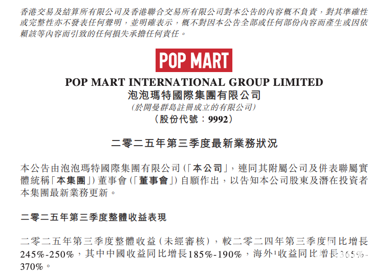 2025年10月21日,泡泡玛特发布2025年第三季度业务状况公告,核心业绩数据表现亮眼。报告显示,公司三季度整体未经审计收益同比增幅达245%-250%,中国市场与海外市场均实现高速增长。
