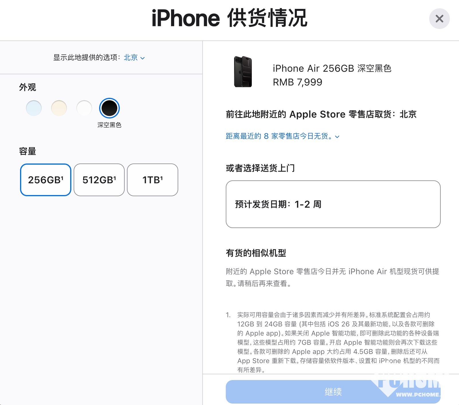 由于机身极为纤薄,国行版iPhone Air热度空前。目前在苹果中国官网,国行版iPhone Air的发货时间为1-2周。在北京Apple Store零售店,国行版iPhone Air也是无货状态。
