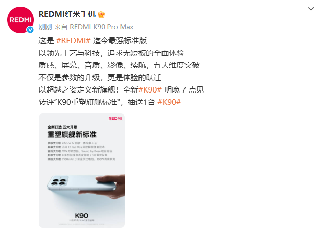 10月22日,据REDMI红米手机官方微博发布,在连续多日为REDMI K90 Pro Max预热后,REDMI红米手机终于在发布前一天正式官宣K90标椎版,与K90 Pro Max同步开始预热。