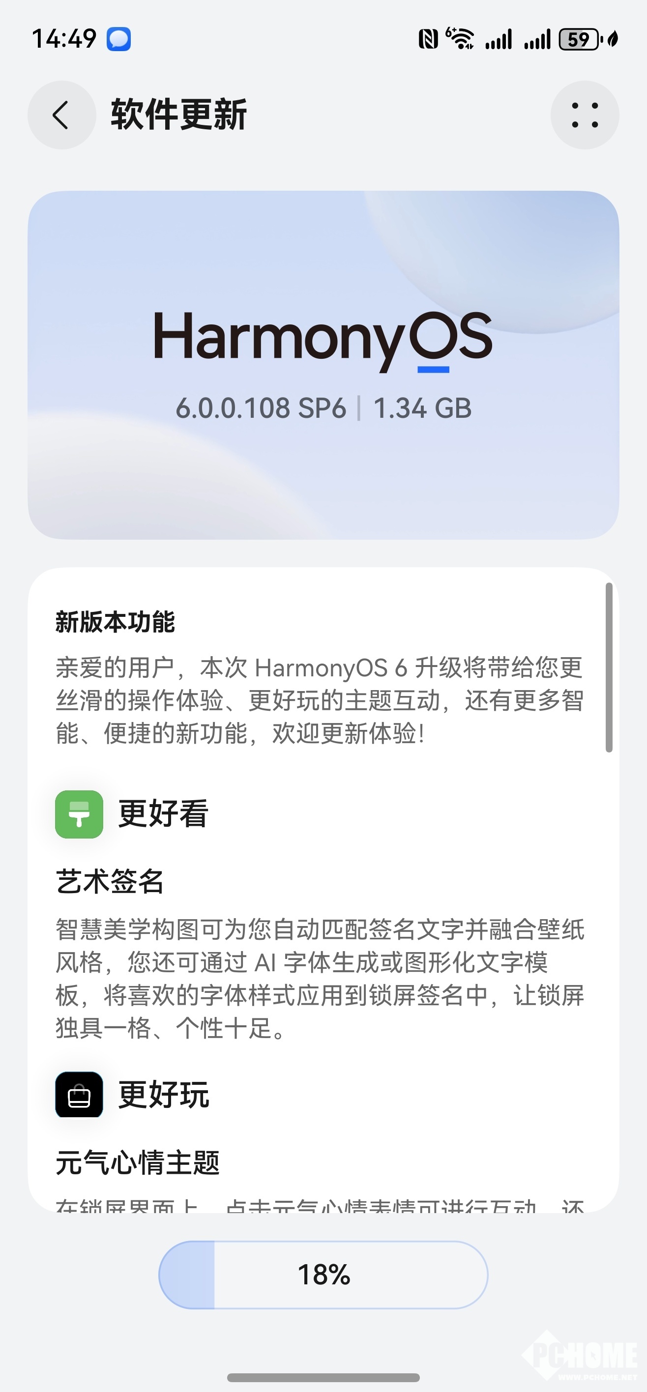 细节方面,鸿蒙操作系统6公测版的版本号为6.0.0.108 SP6,升级包体积为1.34GB。升级介绍显示,鸿蒙操作系统6将带来更丝滑的操作体验、更好玩的主题互动,还有更多智能、便捷的新功能。