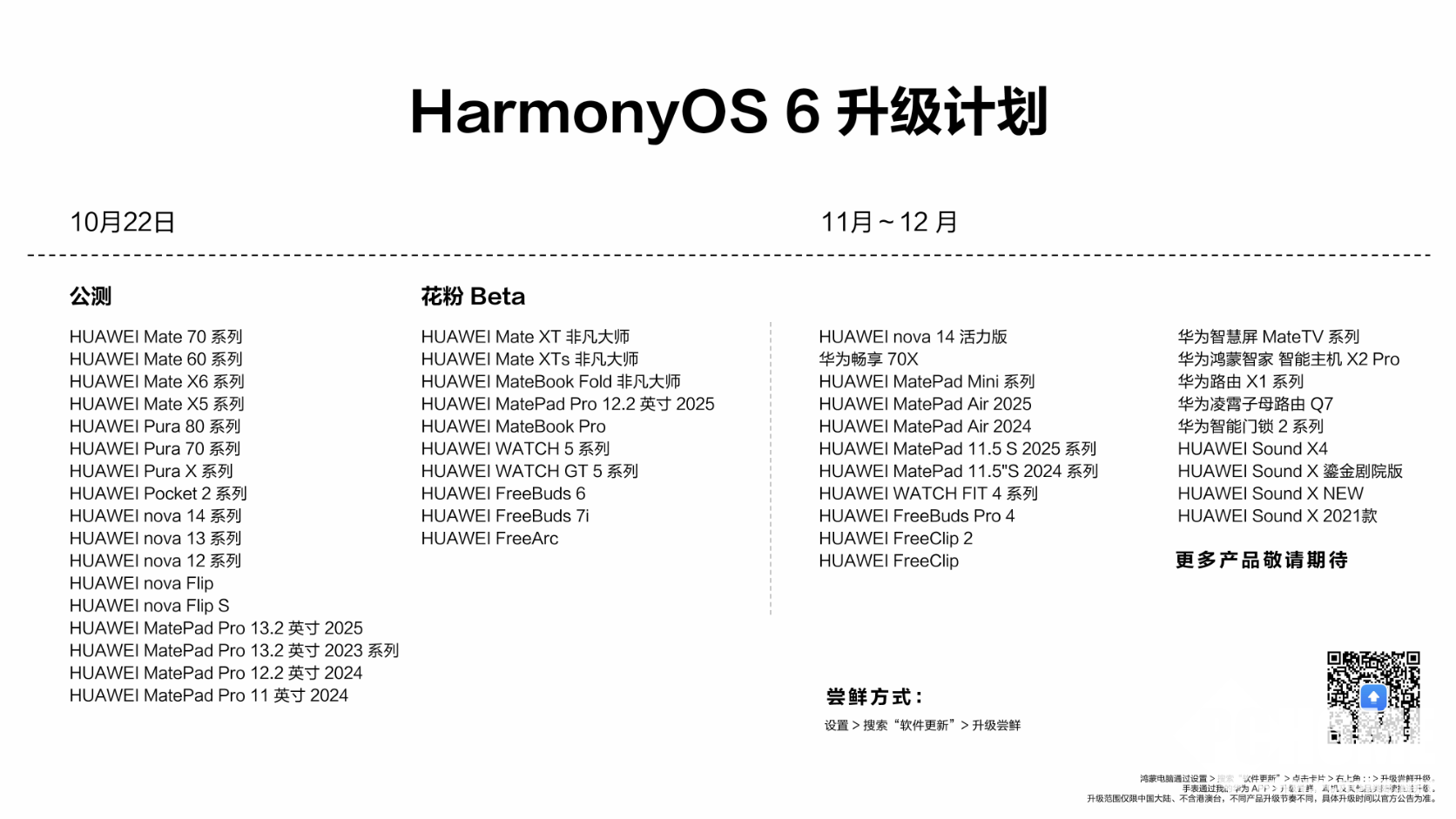 目前,支持机型用户可以在系统设置软件更新或“我的华为”App首页直接申请升级。鸿蒙操作系统6带来了性能提升、跨设备协同优化等新特性。