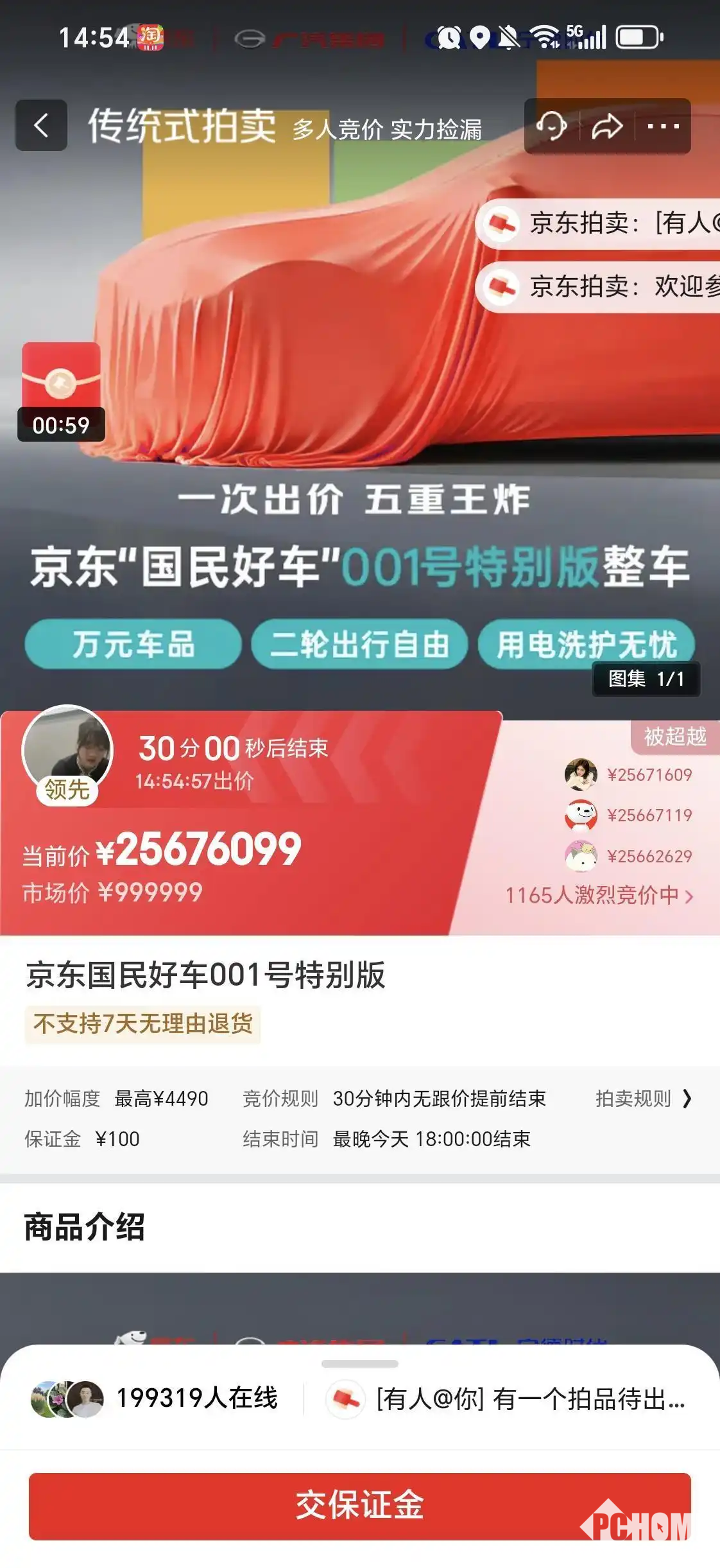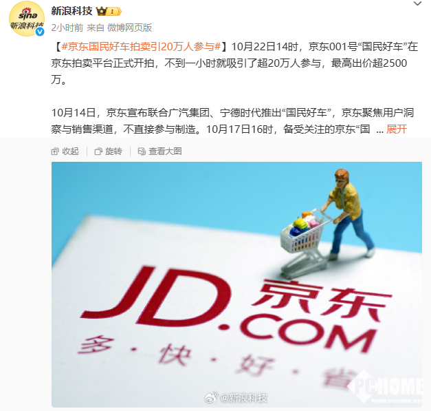 2025年10月22日,据新浪科技报道,京东“国民好车”001号车在“京东拍卖”平台正式开拍,吸引了超过20万人围观直播,近千人参与竞价,最高出价超2500万。