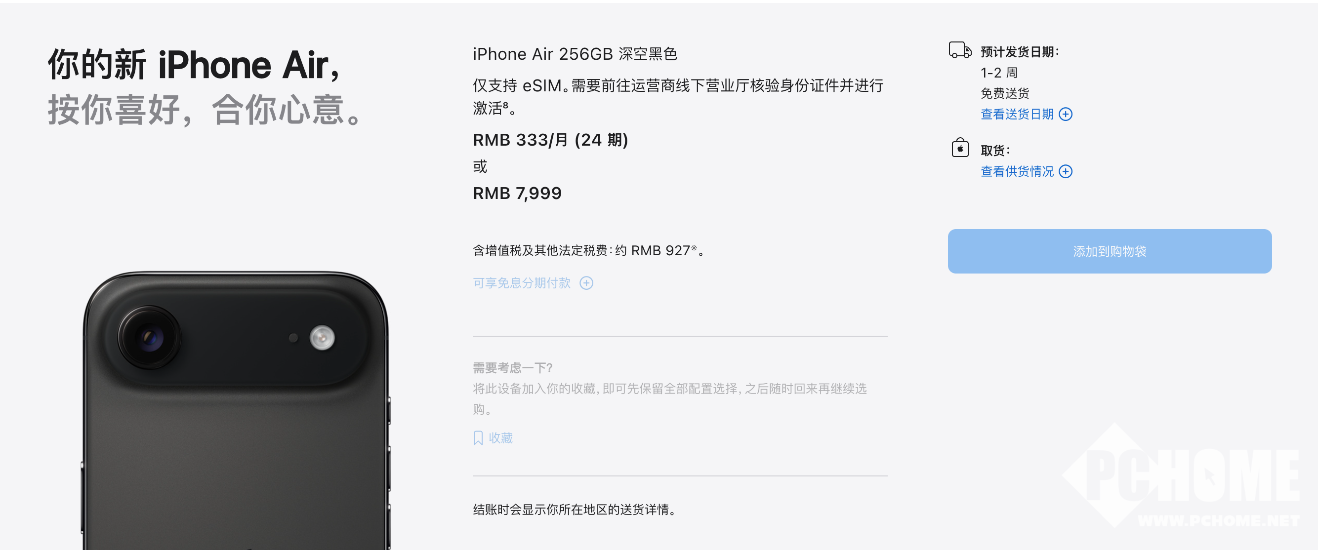 据了解,iPhone Air发布于2025年9月10日。它是史上最薄的iPhone机型,厚度仅5.6毫米,重量165克,采用五级钛合金一体成型工艺与双面超瓷晶面板设计,坚固耐用。配备6.5英寸超视网膜XDR显示屏,支持ProMotion自适应刷新率最高达120Hz。搭载A19 Pro芯片,性能强劲且能效高。后置4800万像素融合式主摄,前置1800万像素Center Stage摄像头,拍照效果出色。提供深空黑色、云白色、浅金色和天蓝色四种外观,国行版起售价7999元,于2025年10月22日正式发售。目前在苹果中国官网,iPhone Air的发货周期仅为1-2周,需求并不十分强劲。