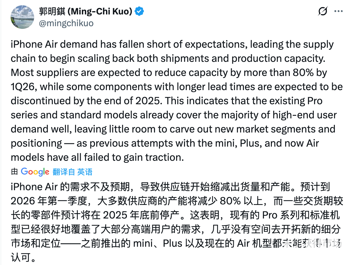 2025年10月23日,天风国际证券分析师郭明錤在社交媒体平台发文称,iPhone Air需求不及预期,供应链已开始缩减出货量和产能。