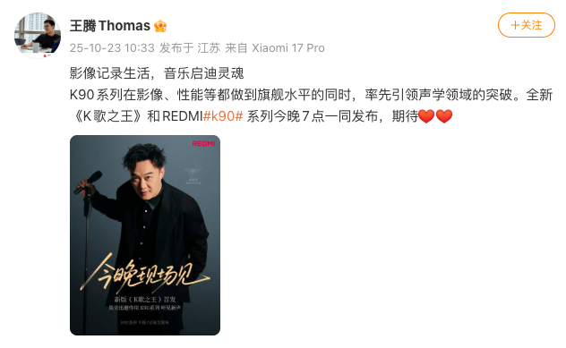 2025年10月23日,前REDMI品牌总经理王腾在社交媒体平台发文,宣传全新《K歌之王》和REDMI K90系列今晚7点一同发布。