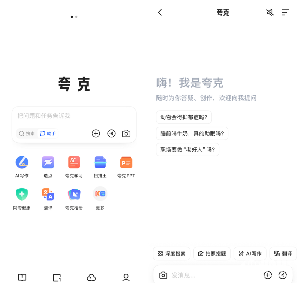 目前,夸克AI对话助手已在夸克App上线,在夸克AI超级款下方特别列出了“搜索”和“助手”两个选项,可供用户自由切换传统搜索与AI对话搜索模式。新加入的AI对话助手内设深度搜索、拍照搜题、AI写作、翻译和打电话等功能,与字节跳动公司旗下豆包高度相似。从输出内容准确度和交互体验来看,夸克AI助手给出的内容响应速度极快,且内容准确性也具有保障。