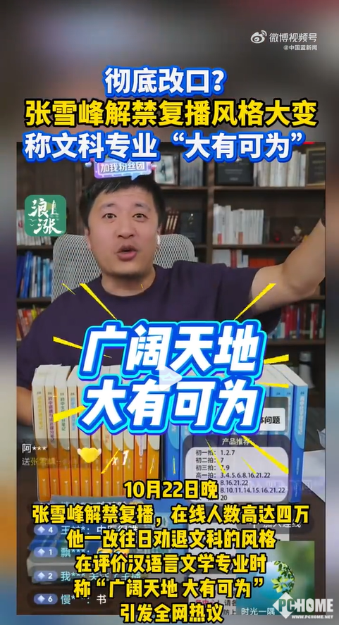 近日,峰学蔚来创始人、研途考研VIP名师、微博知名教育博主张雪峰账号解封后首播,用小号直播连麦,直播间同时在线人数达到4万人,直播时风格大变,称文科专业“大有可为”。