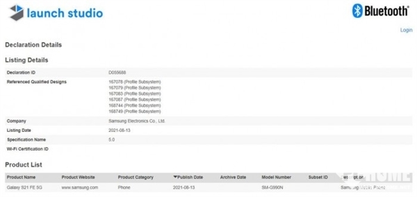 目前蓝牙SIG认证信息表示,三星Galaxy S21 FE的型号包括“SM-G990N”、“SM-G990B”和“SM-G990B_SD”三款,三款均支持蓝牙5.0。