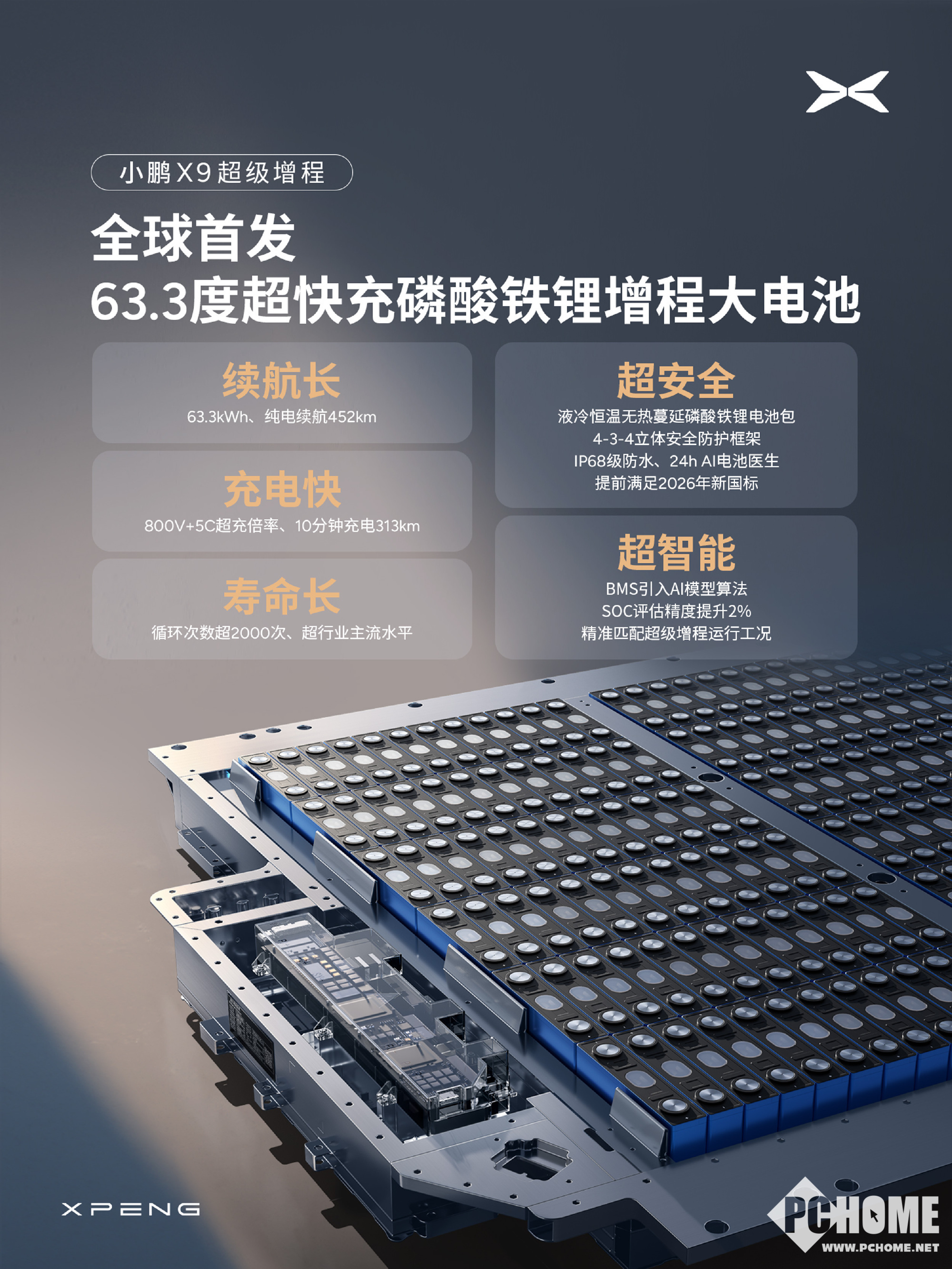 安全性方面,小鹏X9超级增程搭载液冷恒温无热蔓延磷酸铁锂电池包,支持4-3-4立体安全防护框架、IP68级防水、AI 24h电池医生,提前满足2026年新国标,层层安全设计兜底,BMS引入AI模型算法,SOC评估精度提升2%。