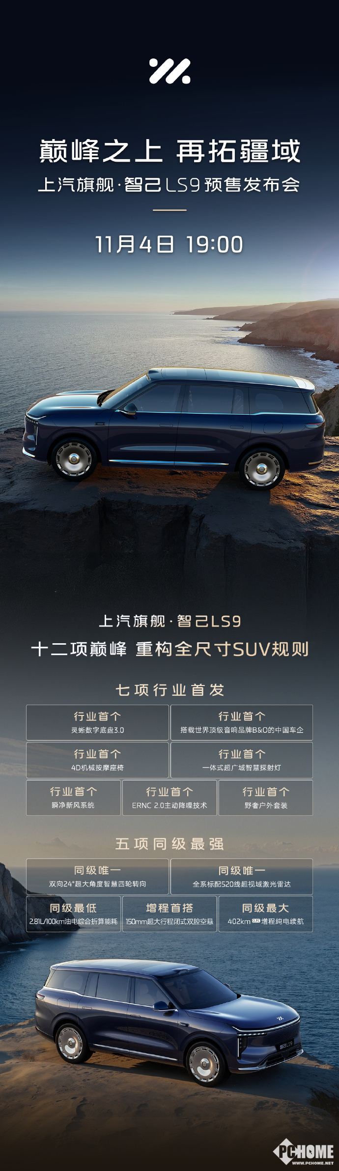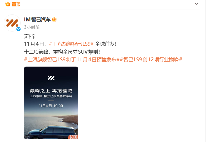 10月27日消息,IM智己汽车官方微博宣布,上汽旗舰智己LS9将于11月4日预售发布。智己LS9是上汽智己品牌的旗舰大六座SUV,定位“上汽集团尖端技术集大成者”。