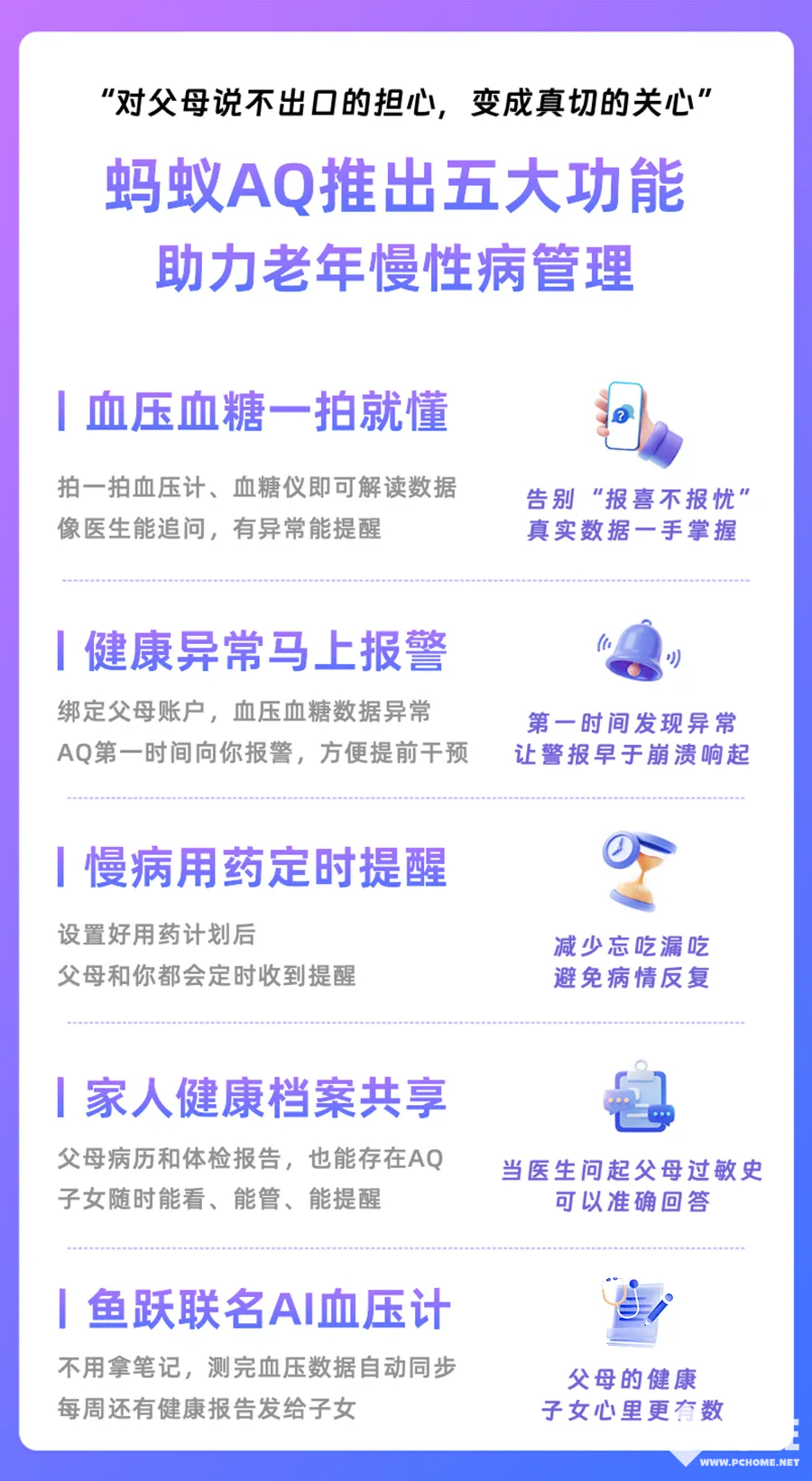 在中国超六成的老人处于独居状态,而AQ上23%的慢病问题,也是由子女代问提出的。据介绍,蚂蚁AQ推出“血压血糖一拍就懂”、“健康异常马上报警”、“慢病用药定时提醒”、“家人健康档案共享”和“鱼跃联名AI血压计”等方便易用的功能助力老年慢性病管理。