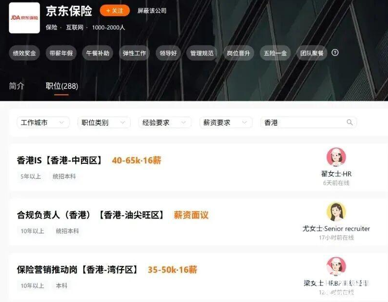 据多个招聘平台显示,京东集团以“京东”、“京东保险”、“京东科技”等主体,开展招聘包括“合规负责人(香港)”、“保险TR”、“保险顾问IS”、“运营总监”等职位,工作地点为中国香港。