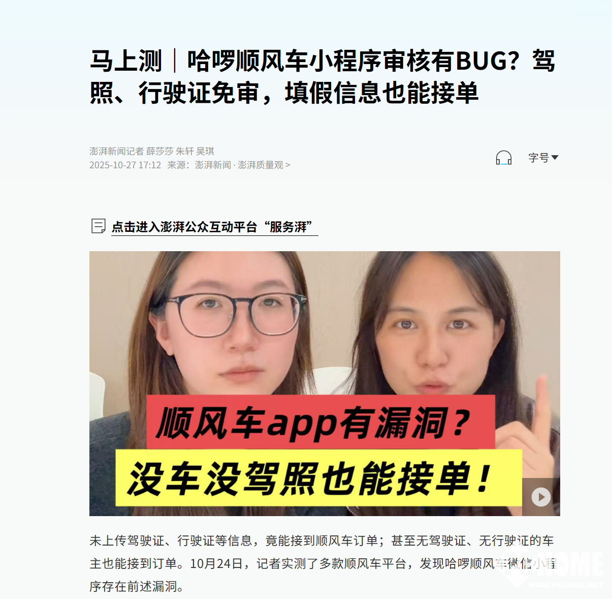《澎湃新闻》:马上测|哈啰顺风车小程序审核有BUG?驾照、行驶证免审,填假信息也能接单_澎湃质量观_澎湃新闻-The Paper