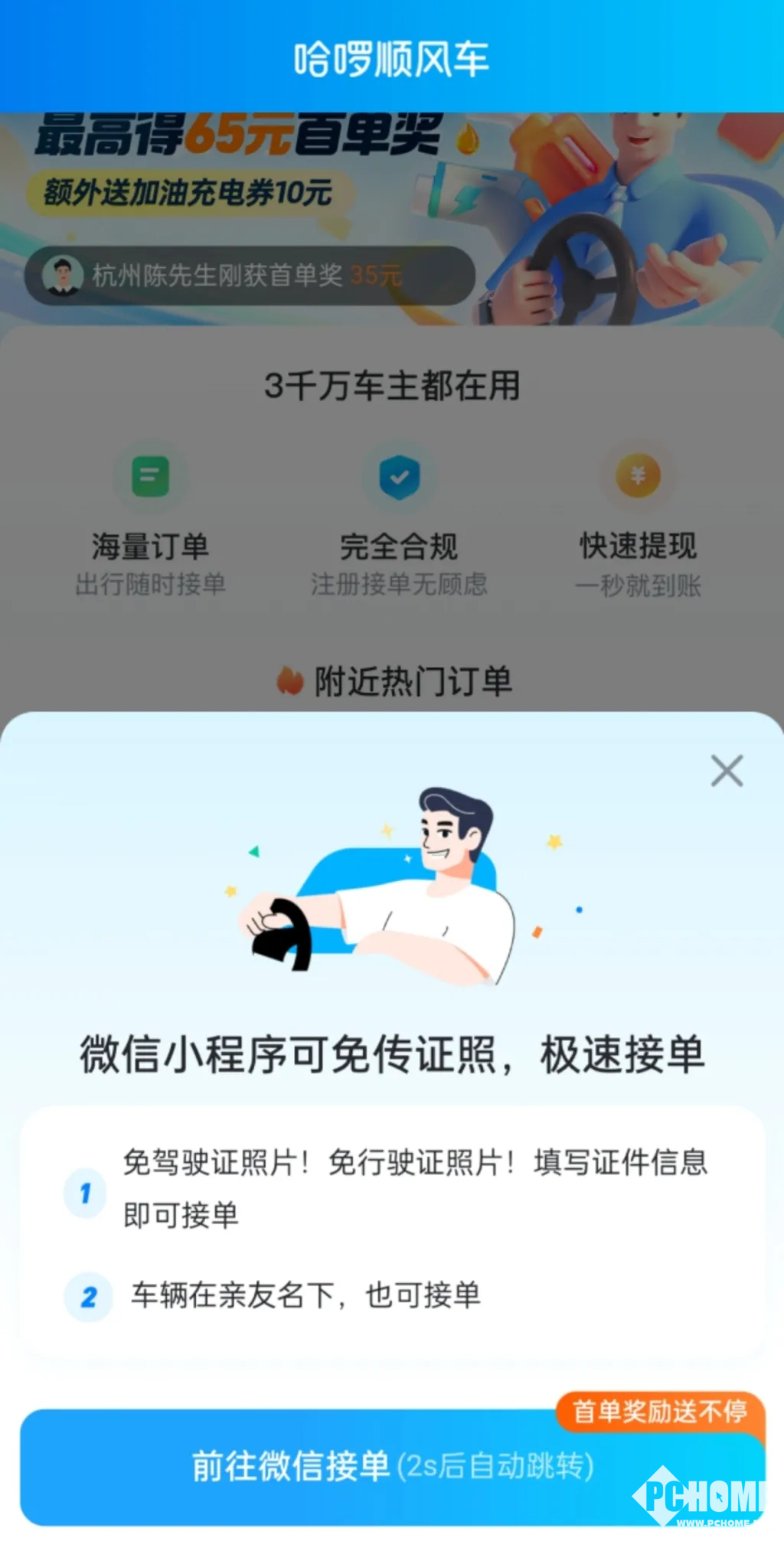 据悉,哈啰App申请成为车主时,系统会显示需提交驾驶证等图片认证,然而当关掉该页面时,系统却提示“微信小程序可免传证照,极速接单”。根据系统指引,澎湃新闻记者在哈啰微信小程序中,输入自己的车辆信息以及另外一人的姓名、身份信息后,结果在该平台成功接到了订单。