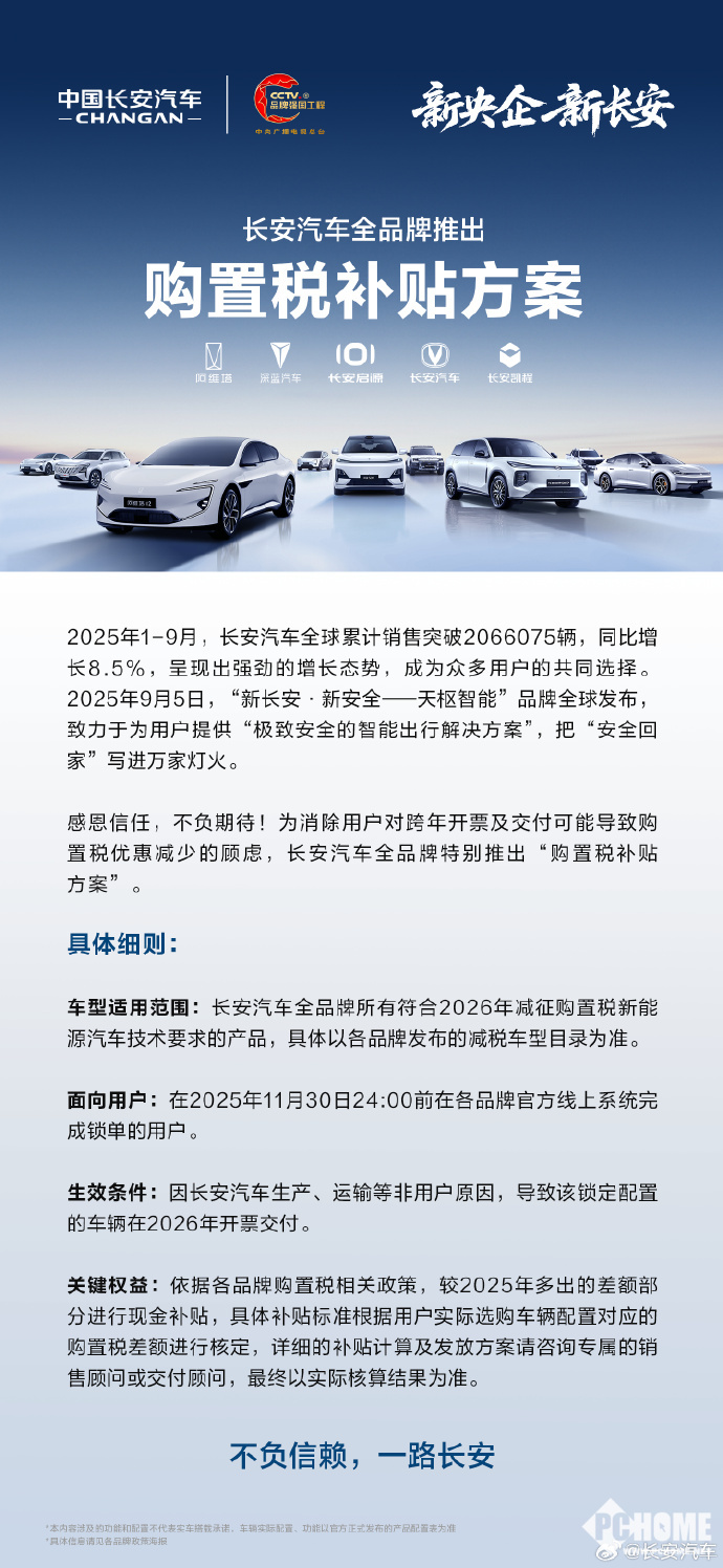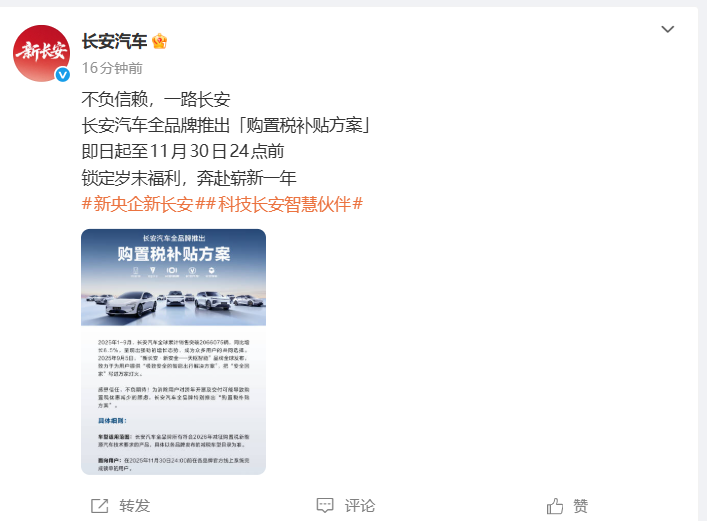 10月28日,长安汽车官方微博正式宣布全品牌推出“购置税补贴方案”,覆盖长安汽车全品牌所有符合2026年减征购置税新能源汽车技术要求的产品。