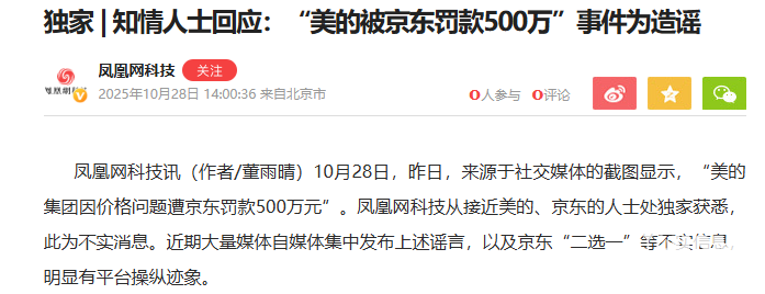 2025年10月28日消息,据凤凰网科技报道,昨日网传“美的因价格违规遭京东罚款500万元”,有消息人士称,此为不实消息,并且近期网络集中出现“京东二选一”相关信息,明显有平台操纵迹象。