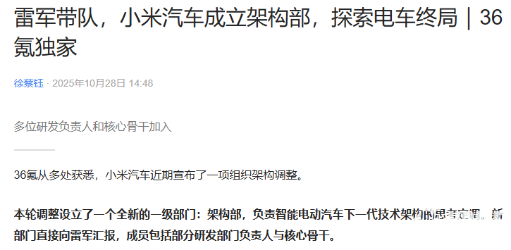 2025年10月28日消息,据36氪报道,小米汽车近期进行了一项组织架构调整,设立了一个全新的一级部门——架构部,负责小米智能电动汽车下一代技术架构的方向与定调。架构部直接向雷军汇报工作,部门成员由小米部分研发部门负责人与核心骨干构成。