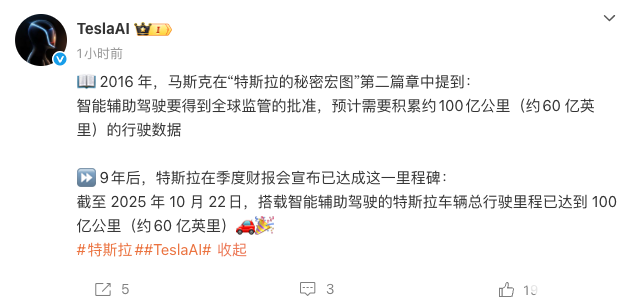 2025年10月28日,特斯拉官微发布消息称,截至2025年10月22日,搭载智能辅助驾驶的特斯拉车辆总行驶里程已达100亿公里。