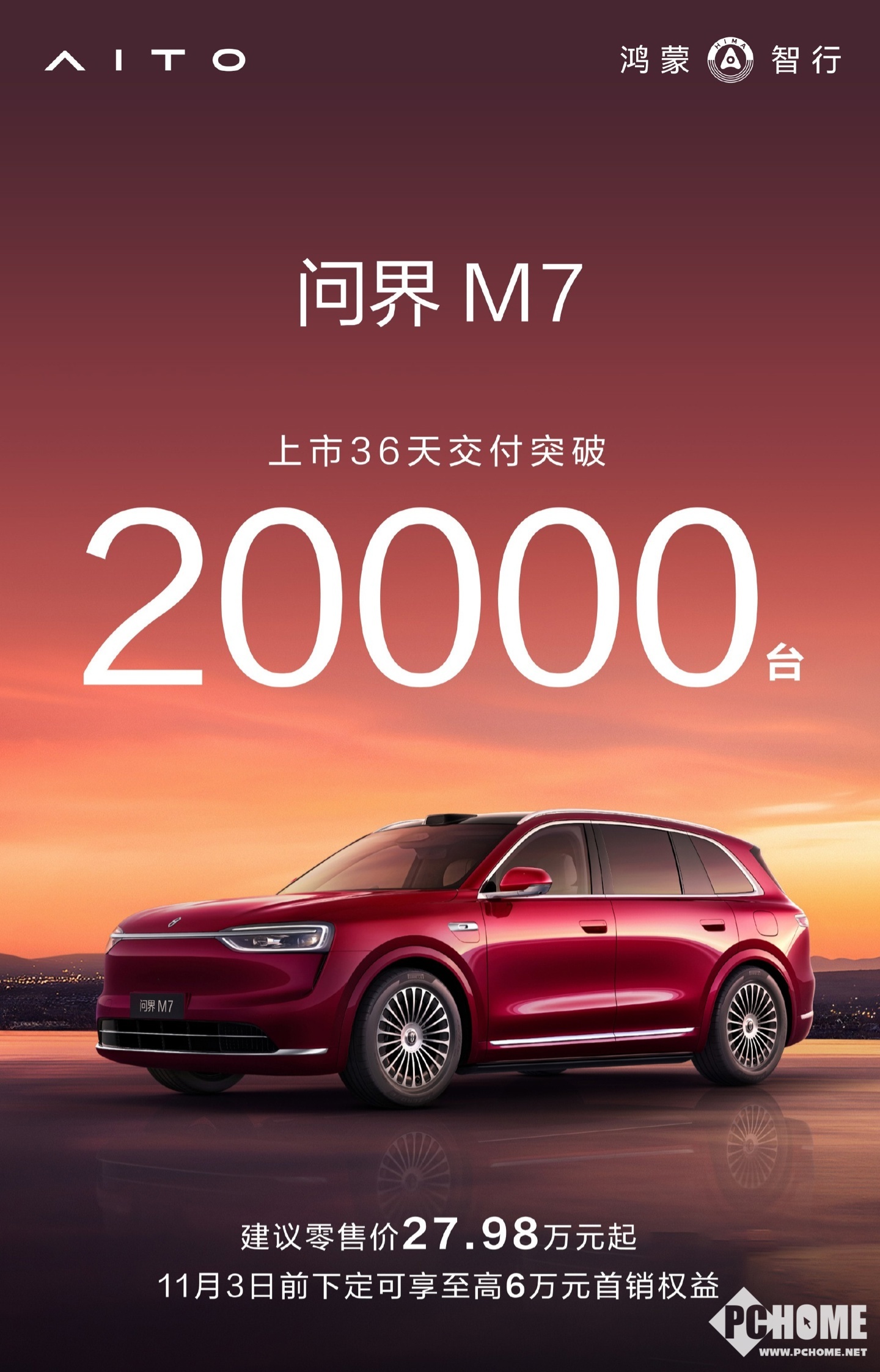 2025年10月29日,鸿蒙智行官微发布消息称,全新问界M7上市36天,交付量突破2万台。