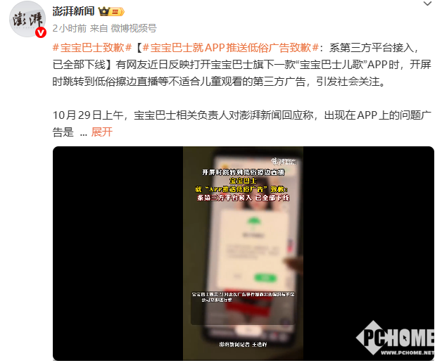 2025年10月29日消息,据澎湃新闻报道,有网友反映,使用“宝宝巴士儿歌”APP时,弹出低俗广告,广告会跳转到含有成人内容、低俗擦边直播平台。儿童使用的APP,竟然弹窗少儿不宜的广告内容,引发家长们的担忧。