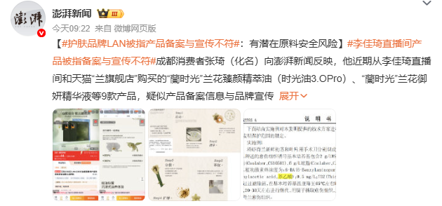 2025年10月29日消息,据澎湃新闻报道,成都消费者反映,近期从李佳琦直播间、天猫“兰旗舰店”购买的化妆品,疑似产品备案信息与品牌宣传不符,有潜在的原料安全风险。