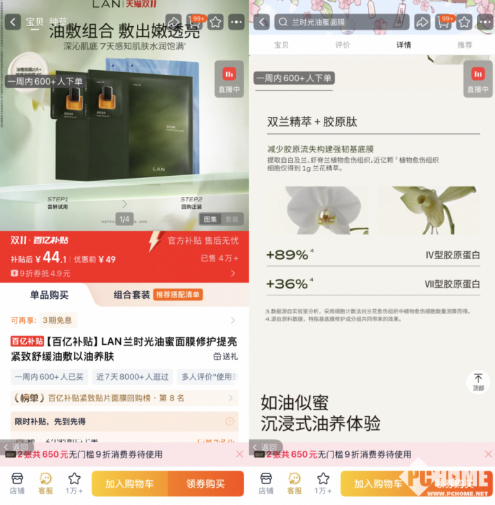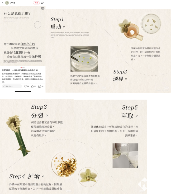 据该消费者介绍,他从李佳琦直播间和天猫“兰旗舰店”购买了“时光兰花”系列7款产品,花费共计1491元。据“兰旗舰店”产品页显示,“时光兰花”系列使用的“双兰精粹”,为“白及兰(BLETILLA STRIATA)、虾脊兰(CALANTHE DISCOLOR)植物愈伤组织”,兰花愈伤组织培养是通过提取植物细胞或组织,经历诱导、分裂、扩增、萃取等步骤,植物干细胞会不断增殖形成淡黄色像果冻一样的愈伤组织。然而,涉事产品备案信息及产品包装上写的均为“兰科植物提取物”,未提及这两种植物愈伤组织。商铺客服回称,“双兰精粹”就是“兰科植物提取物”。