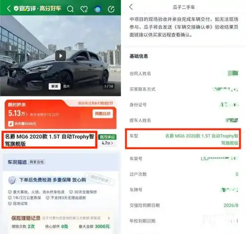 据该消费者介绍,9月22日,他通过瓜子二手车平台,购买了一辆“2020款名爵MG6汽车”,当时车辆信息介绍为“智驾旗舰版”。然而,提车后使用过程中发现,该车并未配备智驾等功能,经多个第三方检测机构,实际车型为更低配置的“旗舰版”,两款车型售价相差6000元。