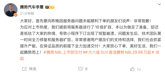 腾势汽车总经理李慧在社交媒体平台发文,向昨晚因服务器问题未能顺利下单的朋友们致歉。为应对上市热度,腾势汽车提前将服务器进行了10倍扩容,本以为做足了准备,却还是低估了消费者的热情。