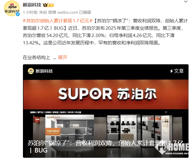 2025年10月29日消息,据新浪科技,苏泊尔发布2025年第三季度业绩报告,苏泊尔营收54.20亿元,同比减少2.30%,归母净利润4.26亿元,同比下降13.42%,今年三季度营收与净利润双双呈现下滑。