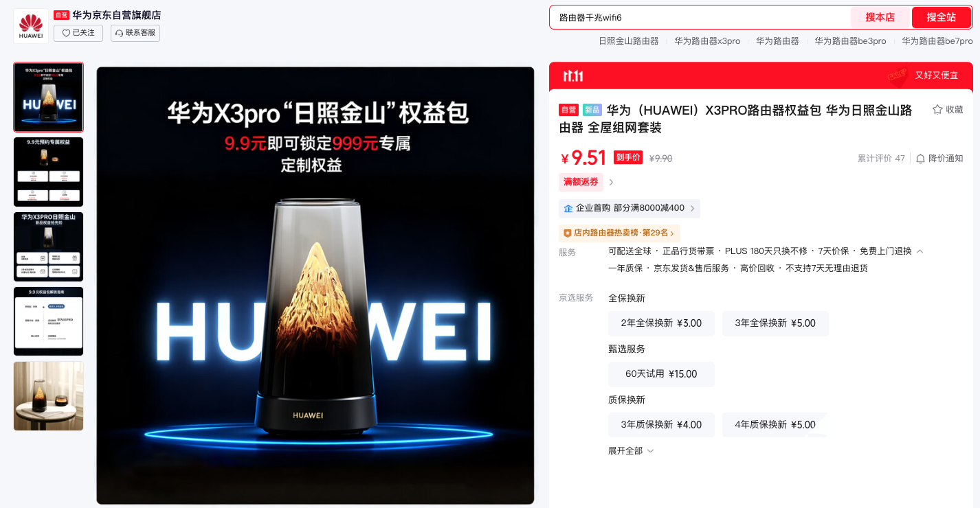2025年10月29日,在京东平台,华为路由X3 Pro开启预约,现在仅需9.9元即可锁定价值999元权益,并可享白条6期免息、以旧换新补贴500元等福利。
