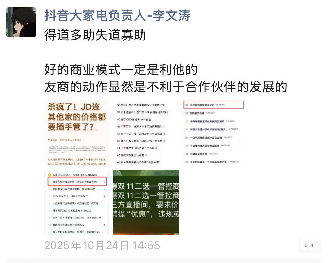根据公开信息,10月24日下午,抖音大家电负责人李文涛在朋友圈发文指责京东低价行为,并分享了相关热搜截图。目前抖音未就价格竞争直接回应,三方说法不一,而这场争议也被视作今年“双十一”电商价格战的序幕。