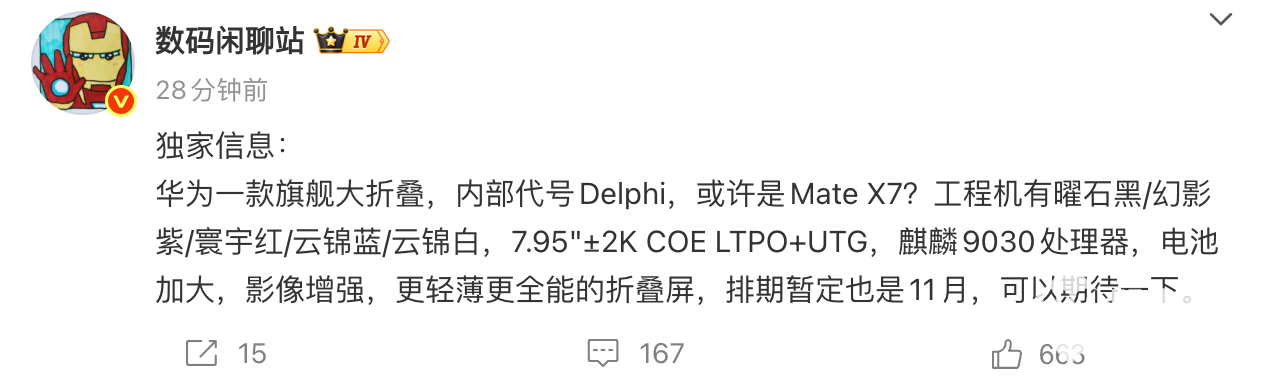 2025年10月30日,知名数码博主“数码闲聊站”爆料称,华为计划推出一款旗舰大折叠手机,内部代号Delphi,或许是Mate X7。