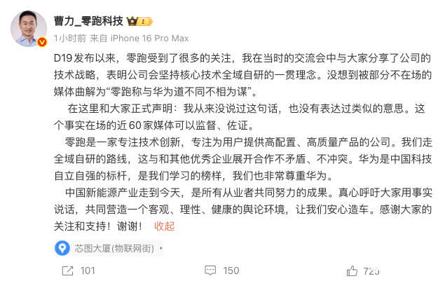 对此,2025年10月30日,曹力在社交媒体平台发文称,自己从来没说过“零跑称与华为道不同不相为谋”,也没有表达过类似的意思。曹力表示,零跑是一家专注技术创新,专注为用户提供高配置、高质量产品的公司。“我们走全域自研的路线,这与和其他优秀企业展开合作不矛盾、不冲突。华为是中国科技自立自强的标杆,是我们学习的榜样,我们也非常尊重华为。”