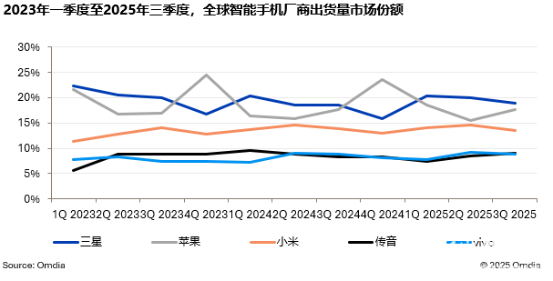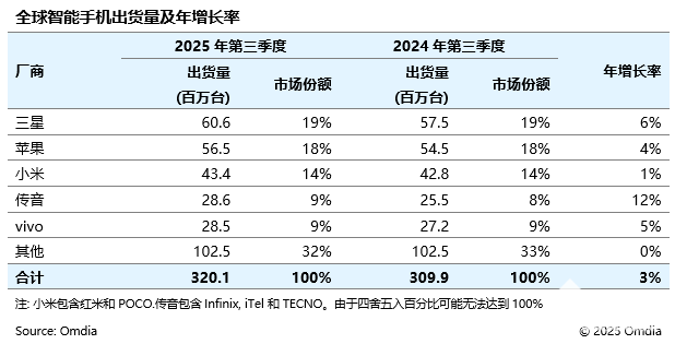Omdia(原Canalys)披露了2025年第三季度全球智能手机出货量报告,合计出货量为3.201亿台,同比增长3%,显示出上半年疲软后的复苏迹象。