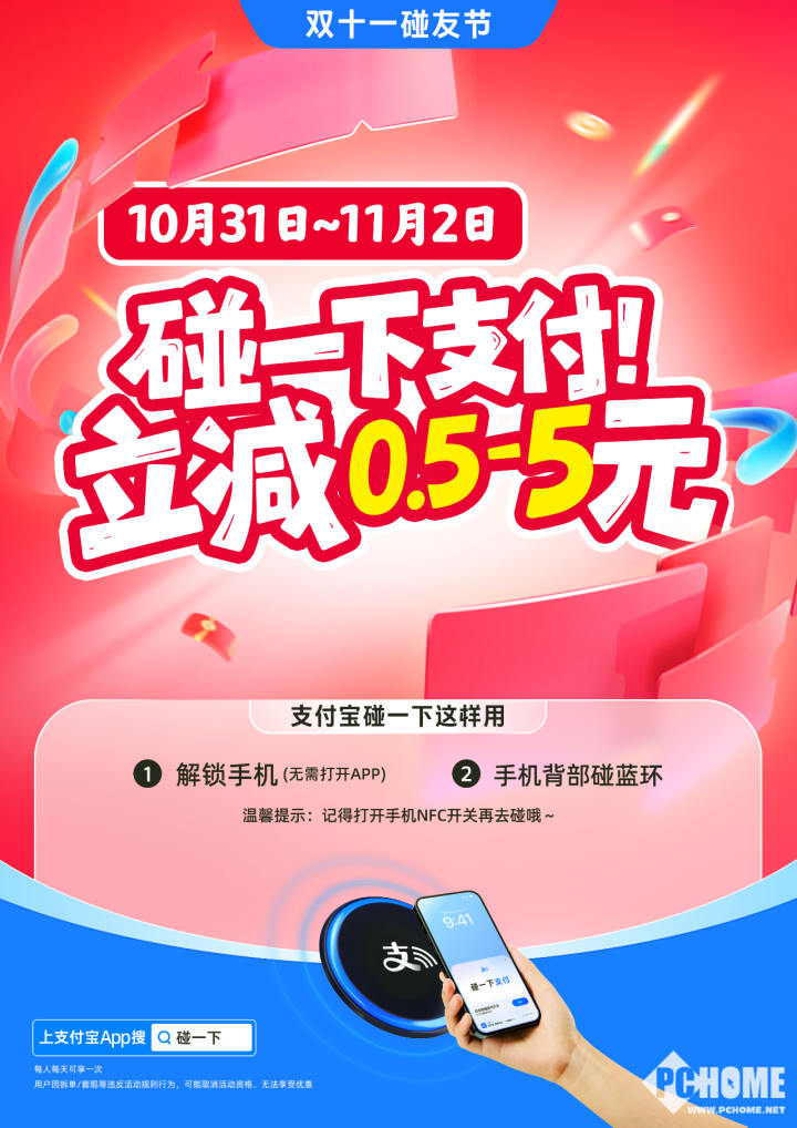 2025年10月31日,支付宝官微发布消息称,本周五至周日(10月31日-11月2日)双11碰友节“疯狂”发福利连续3天,碰一下支付立减0.5-5元。