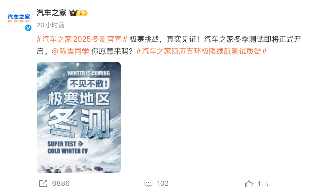 2025年10月31日,汽车之家官微发布消息称,“极寒挑战,真实见证!汽车之家冬季测试即将正式开启。”值得注意的是,汽车之家还特别艾特了陈震,并问道“你愿意来吗?”