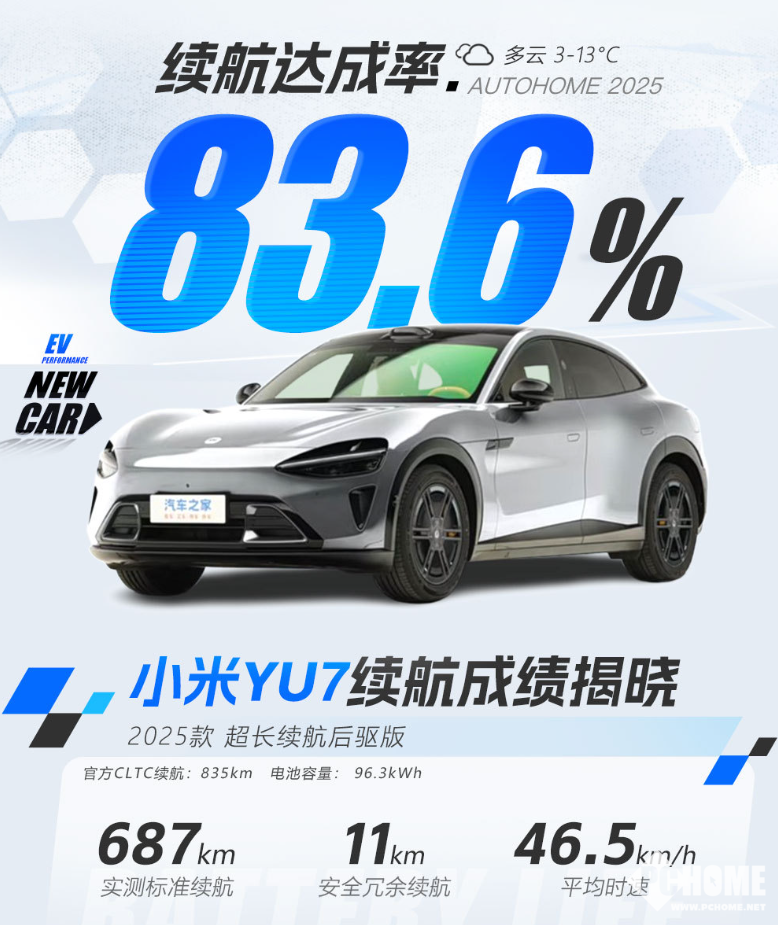 据了解,此前,汽车之家针对小米YU7、理想i6、特斯拉Model Y进行了“冬测”,结果小米YU7实测标准续航687km,续航达成率83.59%。理想i6实测标准续航573.9km,最终续航达成率82.01%;特斯拉Model Y实际标准续航469.8km,续航达成率81.94%。