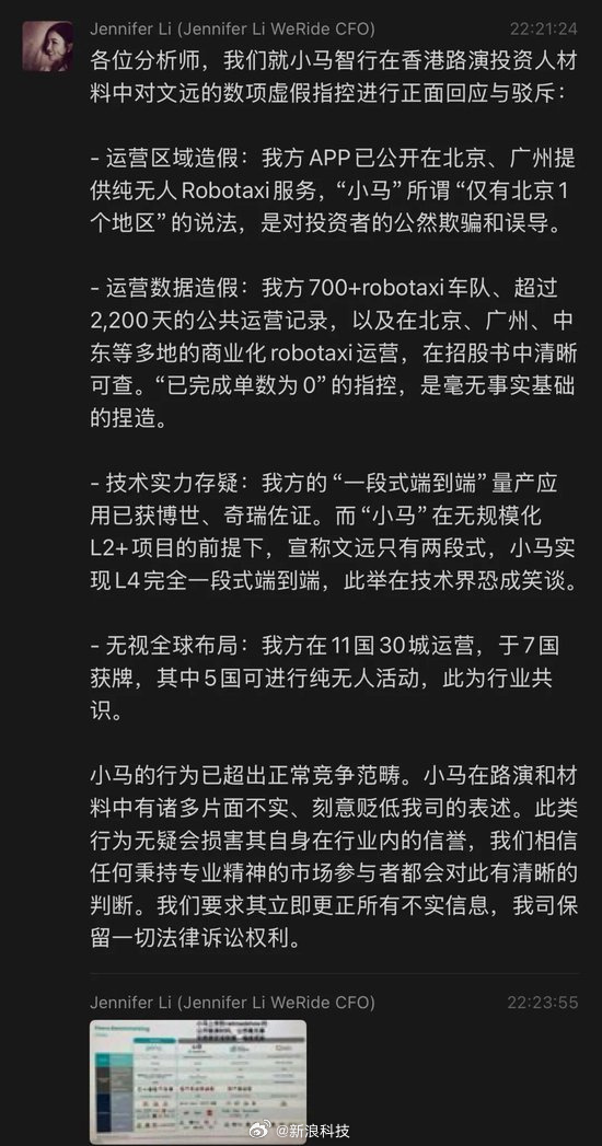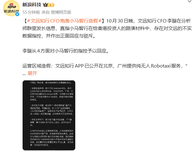 2025年10月31日消息,作为全球自动驾驶技术(Robotaxi )头部企业,文远知行与小马智行颇有渊源,两家公司均源自百度自动驾驶业务体系,主创人员曾在百度任职。据新浪科技,近日,文远知行CFO李璇在分析师群发长文,炮轰小马智行在香港路演投资人材料中造假,存在对文远知行的不实数据指控,刻意贬低文远知行。