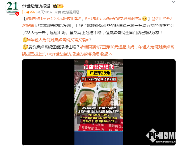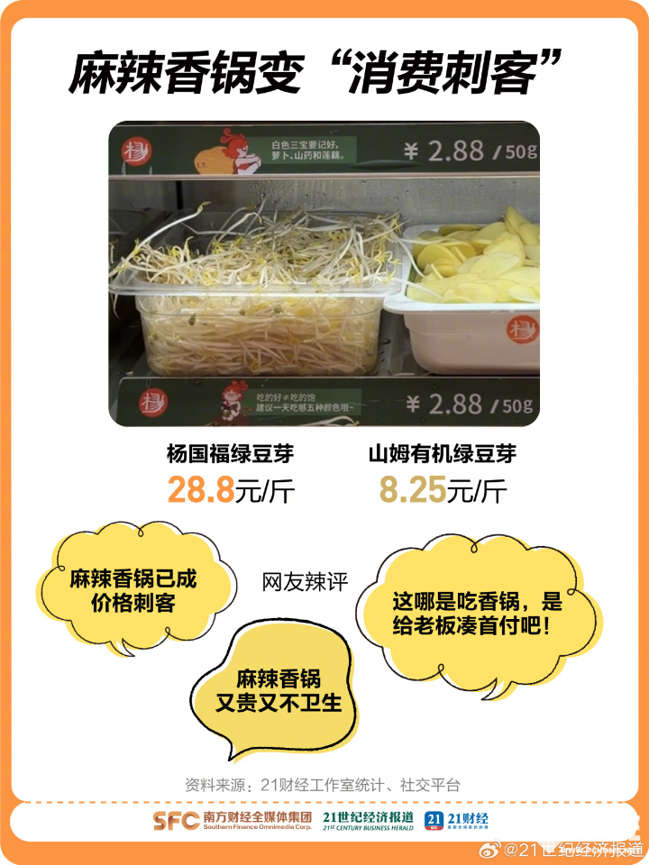 2025年11月1日消息,据21世纪经济报道,近期杨国福推出“麻辣香锅”业务,布局品牌的第二增长曲线。然而,杨国福麻辣香锅的普通绿豆芽价格竟然达到28.8元/斤,比山姆会员商店有机绿豆芽还贵3倍多,人均50元的麻辣香锅变消费刺客。