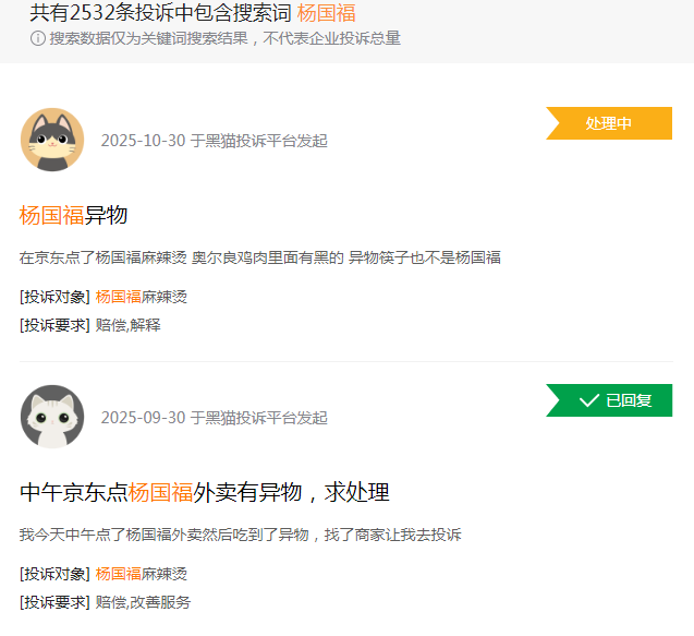 目前,杨国福集团全球门店数量接近7000家,已进入全球20多个国家和地区。据网友们吐槽,“称重刺客”50元也买不到一份能吃饱的午餐,食材新鲜度参差不齐,门店卫生时好时坏。据黑猫投诉平台显示,针对杨国福投诉达2532条,投诉多为“异物”等卫生问题。