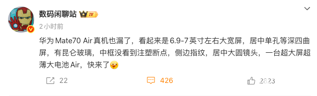 11月3日,知名数码博主“数码闲聊站”爆料称,华为Mate 70 Air将搭载6.9-7英寸左右大宽屏,居中单孔等深四曲屏,有昆仑玻璃,或采用塑料中框,侧边指纹,居中大圆镜头,一台超大屏超薄大电池Air。