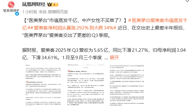 2025年11月3日消息,曾被誉为“医美茅台”的爱美客发布2025年第三季度报告,报告显示,公司前三季总营业收为18.65亿,同比下降21.49%,归母净利润为10.9亿,同比下降31.05%。第三季度营收为5.65亿,同比下降21.27%,归母净利润3.04亿,同比下降34.61%。连续4个季度营收、净利润下滑,爱美客陷入业绩“失速”困境。