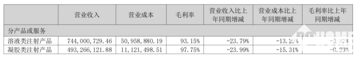 不过,近两年,爱美客的“嗨体”与“濡白天使”两大核心产品失去“独占市场”优势,业绩增速放缓。2024年7月,华熙生物的“润致·格格”获批上市,成为国内第二款复合溶液Ⅲ类医疗器械产品,与爱美客的“嗨体”展开直接竞争。而爱美客的“濡白天使”则面临众多产品挑战,华东医药的伊妍士少女针、长春圣博玛艾维岚童颜针等产品,都与“濡白天使”直接构成竞争。据2025年半年报显示,爱美客的“嗨体”为核心的溶液类注射产品,半年收入为7.44亿,同比下滑23.79%,以“濡白天使”为核心的凝胶类注射产品,半年收入为4.93亿元,同比下滑23.99%。