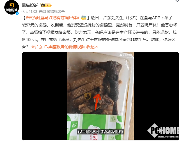 2025年11月3日消息,黑猫投诉账号发文,近日,有消费者通过“盒马”APP购买了一盒“卤鹅”,发现在未拆封的情况,盒内竟然有一只苍蝇。盒马客服回应称,可能是在包装过程中出的问题,按照规定只能退款,赔偿100元。