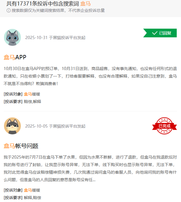 据黑猫投诉平台显示,有相关投诉达1.7万多条,有网友反映,他通过盒马APP购买水果,因为水果不新鲜,进行了退款。此后该网友的盒马账号显示“帐号异常”,无法操作下单,疑似被拉入黑名单。