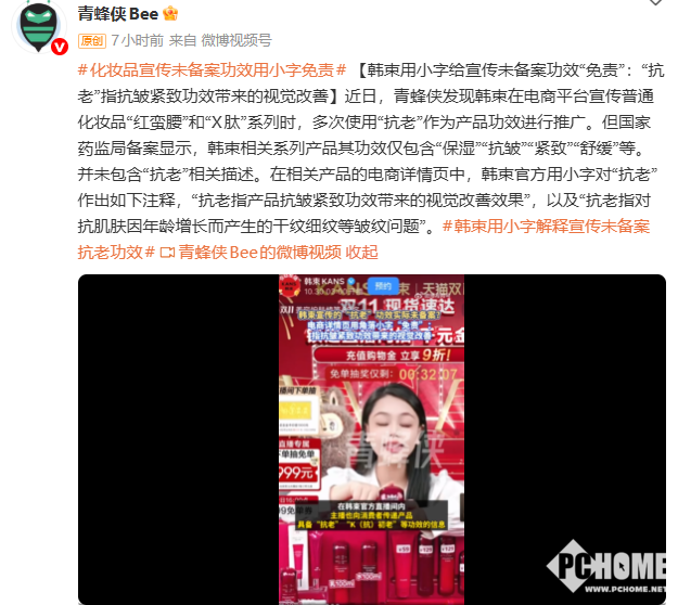 2025年11月3日消息,据青蜂侠报道,国产美妆品牌韩束再涉虚假宣传,在电商平台宣传普通化妆品“红蛮腰”和“X肽”系列时,多次使用“抗老”功效作为卖点推广宣传,而备案信息中并未有“抗老”相关描述,仅在详情页使用“小字”免责。