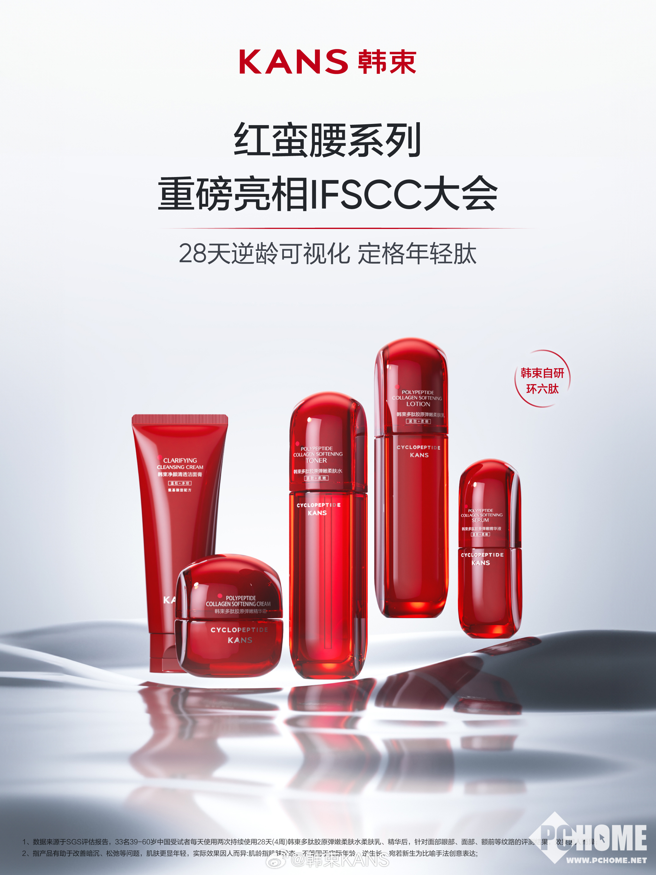 在韩束相关产品宣传物料中,红蛮腰系列的海报上有两行小字为:1、数据来源于SGS评估报告,33名39-60岁中国受试者每天使用两次持续使用28天(4周)韩束多肽胶原弹嫩柔肤水柔肤乳、精华后,针对面部眼部、面部、额前等纹路的评测结果,效果因人而异。2、指产品有助于改善暗沉、松弛等问题,肌肤更显年轻,实际效果因人而异,肌龄指肌肤状态,不等同于实际年龄,逆生长、宛若新生为比喻手法创意表达。