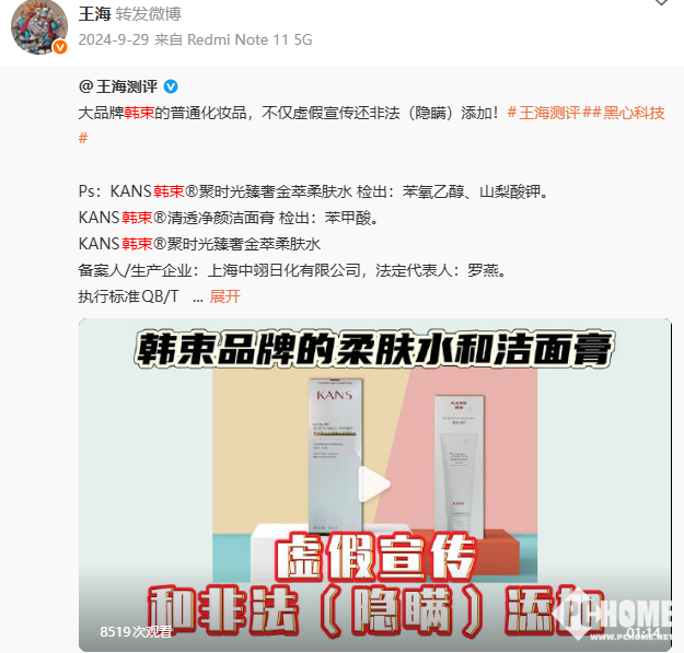 值得注意的是,2016年,韩束曾经被上海市工商局列入虚假违法广告年度十大典型案例,韩束广告称“越晒越白,越晒越润”,广告构成虚假宣传,被工商部门依法处罚款110万元。此外,2024年打假博主王海曾爆料,韩束涉嫌虚假宣传以及隐瞒未经备案添加防腐剂等。