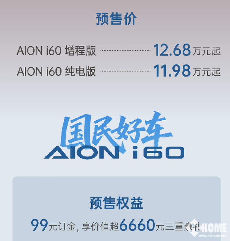 11月3日,广汽埃安全新i系列首款车型AION i60正式开启预售,纯电版预售价11.98万元,增程版预售价12.68万元。作为品牌首款增程车型,该车以紧凑型大五座SUV定位切入市场,剑指比亚迪宋Pro、深蓝S05等竞品。