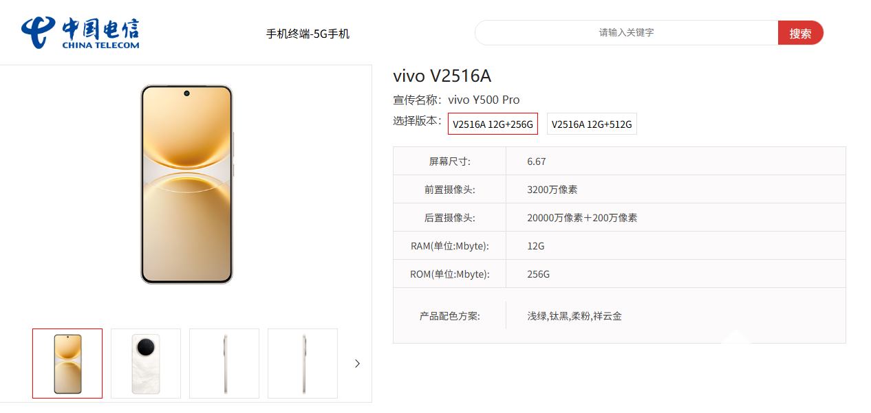 11月4日,型号为“vivo V2516A”的vivo Y500 Pro已现身中国电信终端产品库,与此同时vivo官方宣布该机将于11月10日19:00正式发布,定位“国民小旗舰”。